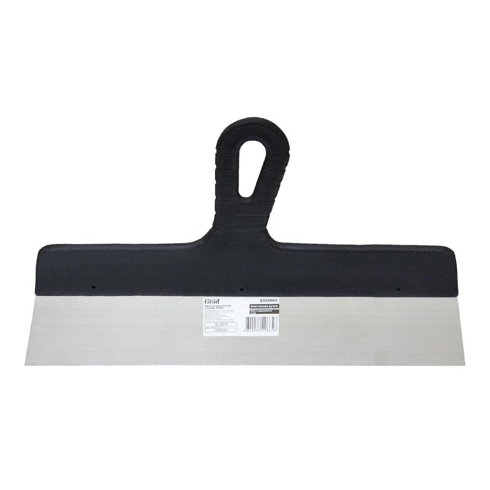 Шпатель стандарт (неіржавкий) 350 мм Grad (8320665) з лезом із неіржавкої сталі та пластиковою ручкою. Шпатель застосовується для оштукатурування зовнішніх і внутрішніх стін, стель — для нанесення шпаклівок, мастик і густих клейових сумішей.